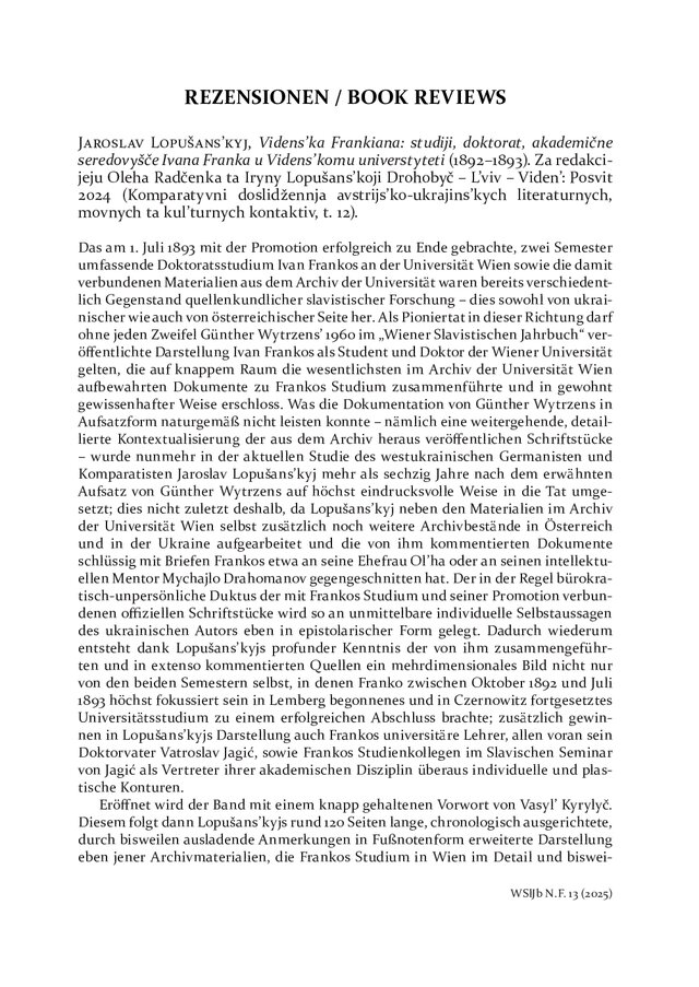 Jaroslav Lopušans’kyj, Videns’ka Frankiana: studiji, doktorat, akademične seredovyšče Ivana Franka u Videns’komu universtyteti (1892–1893). Za redakcijeju Oleha Radčenka ta Iryny Lopušans’koji Drohobyč – L’viv – Viden’: Posvit 2024 (Komparatyvni doslidžennja avstrijs’ko-ukrajins’kych literaturnych, movnych ta kul’turnych kontaktiv, t. 12).